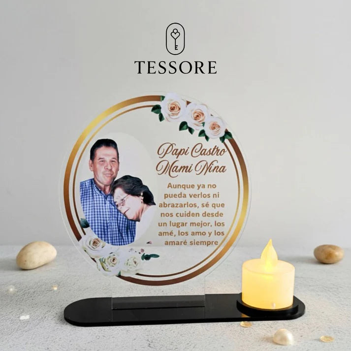 Un recuerdo lleno de amor y significado para honrar a quienes siempre estarán en tu corazón. Este galvano se personaliza con la foto de tu ser querido y está acompañado de una delicada vela LED , que simboliza la luz que permanecerá encendida por siempre, como reflejo de su recuerdo eterno.