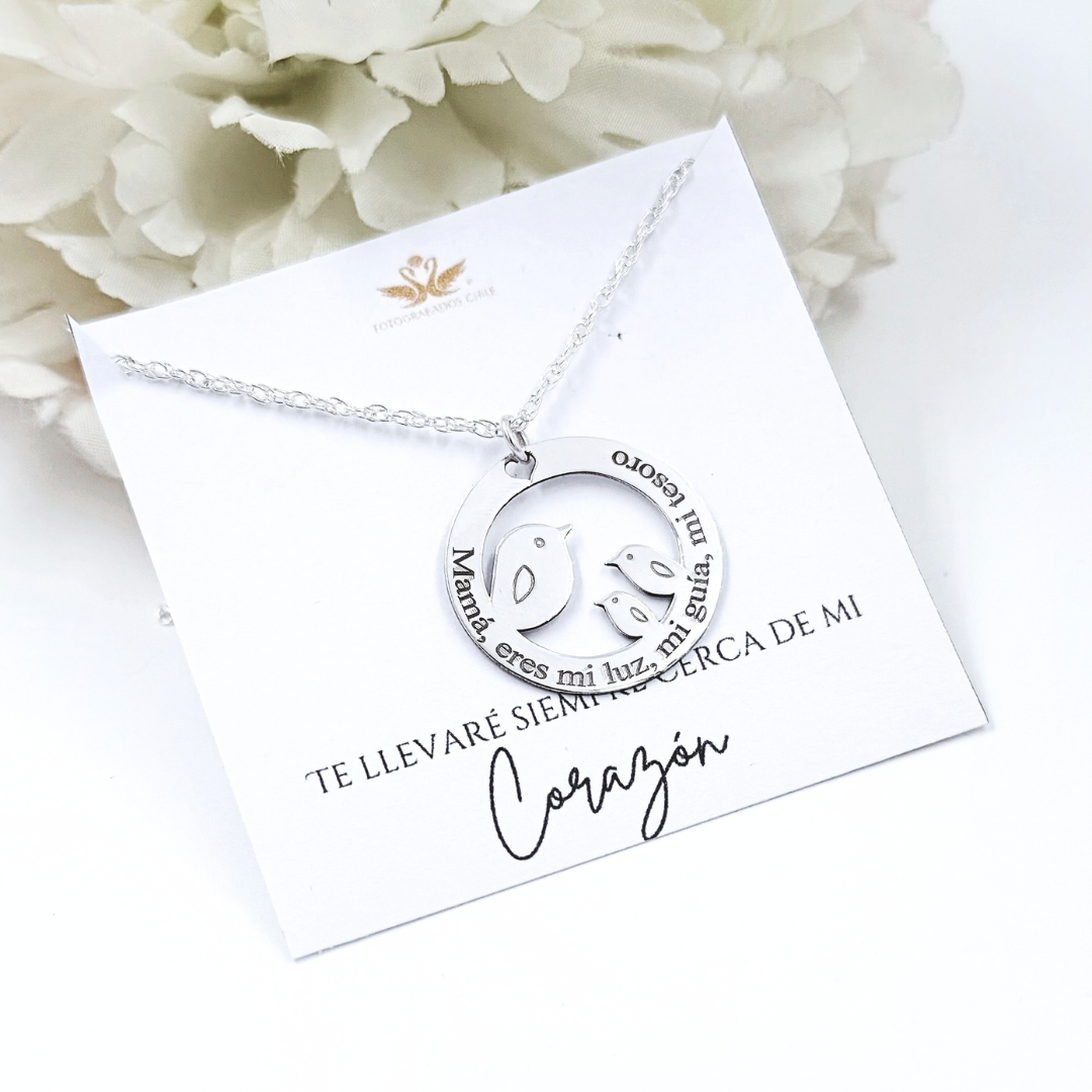 Este hermoso collar, cuidadosamente fabricado en plata ley 950, representa el lazo eterno entre una madre y sus hijos. Las delicadas siluetas de los pajaritos simbolizan protección, amor incondicional y esa guía silenciosa que solo una madre sabe dar.