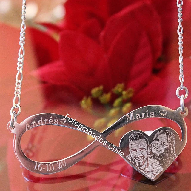 Un hermoso y exclusivo infinito fotograbado realizado en plata 950. Disponible con cadena de corazones