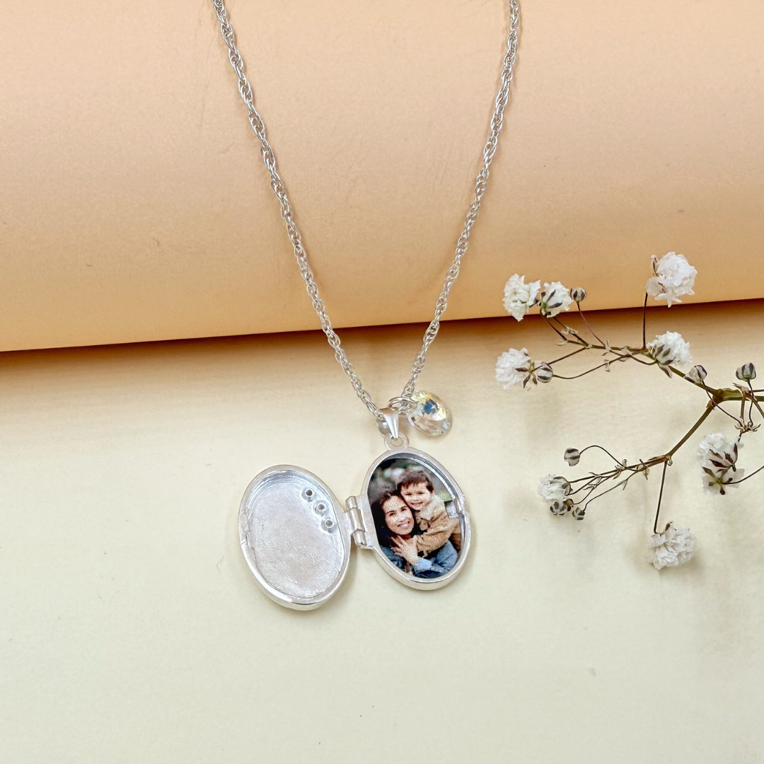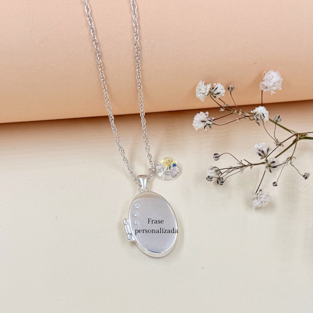 Este relicario te permite llevar siempre contigo a quien amas, acompañado de un grabado personalizado en la tapa que hará de tu collar una pieza única.